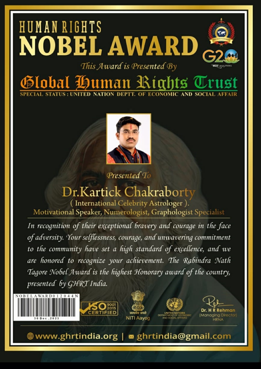 𖣔 Prestigious Awards received by Dr.Kartick Chakraborty – Top Best Celebrity Astrologer in Guwahati, Assam 𖣔