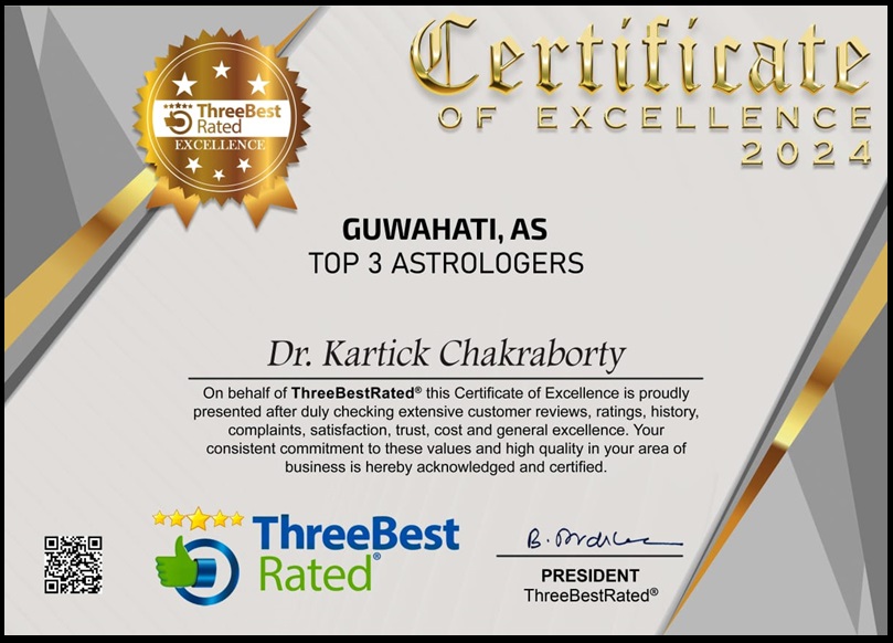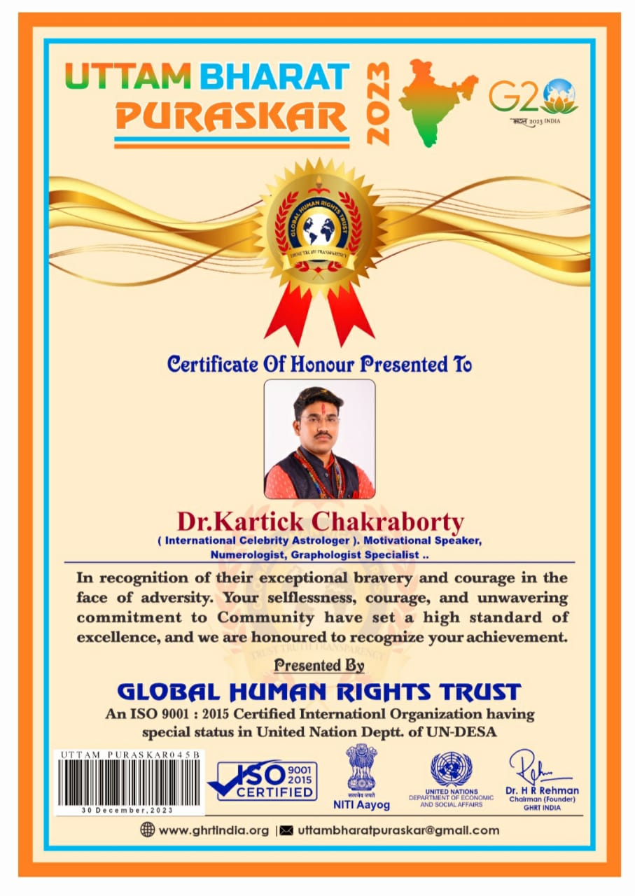 Dr. Kartick Chakraborty, a celebrated Top Premium Astrologer from Guwahati, Assam, is known for his deep knowledge of Vedic Astrology - Numerology - Energy Healling - Grandmaster Prediction - Numerology Number Base Predictions- Universal Prayer - Black Magic Kriya Specialist - Maha Vashikaran Kriya Specialist - Love Relationship Problem Specialist - Marriage Life Related Problem Specialist And Kamakhya Tantra Vidya Kriya Specialist. With 24+ years of experience, he has established himself as a trusted guide for those seeking clarity in life. One of the most intriguing aspects of his practice is his ability to combine traditional astrological techniques with modern approaches, offering holistic solutions. Dr. Kartick Chakraborty has been featured in various national and international forums, earning accolades for his accuracy and 100% Accurate predictions. His client base spans across Bollywood celebrities, Tollywood Celebrities, Politicians, National & International Pilots - International Businessman - Top Level Government Officers - CEO, CFO, COO, CIO, CTO Of top companies worldwide individuals from different walks of life, all of whom vouch for his genuine and transformative guidance. Dr.Kartick Chakraborty is one of the astrologers in India who received the Bharat Bhushan Award from the Government of India, New Delhi.