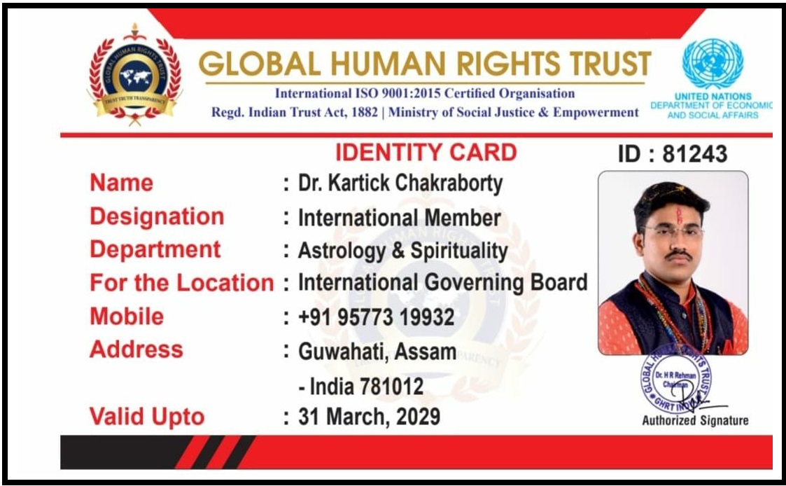 Dr. Kartick Chakraborty is a distinguished astrologer and tantrik practitioner based in Guwahati, Assam, renowned for his expertise in Vedic astrology and Tantra Vidya Kriya Specialist. Dr.Kartick Chakraborty is one of the astrologers in India who received the Bharat Bhushan Award from the Government of India, New Delhi.